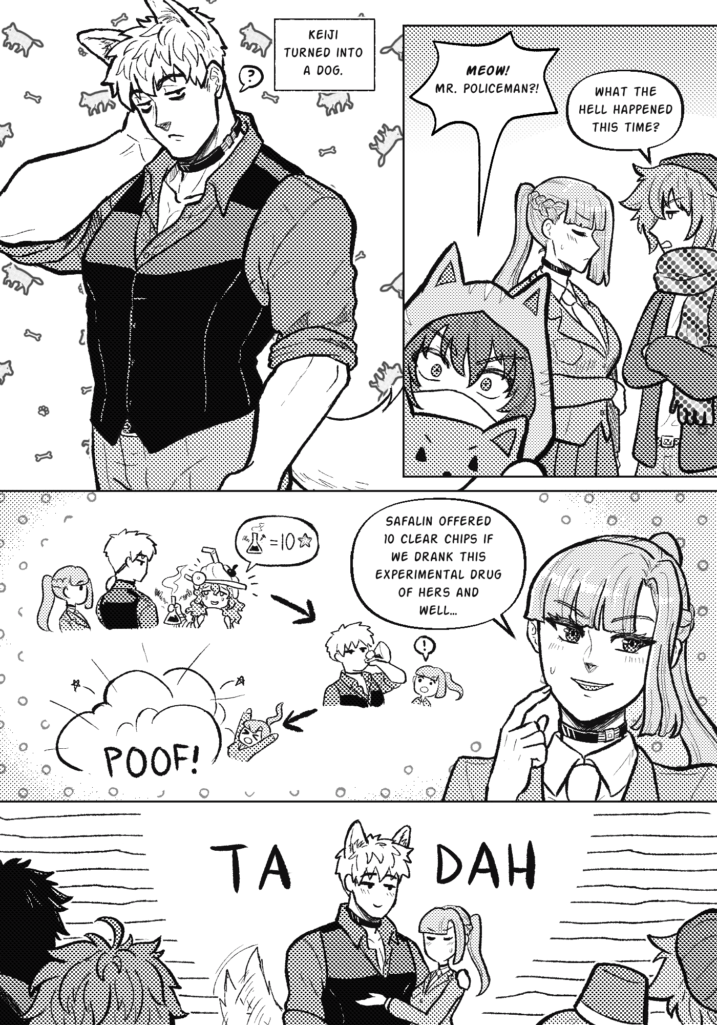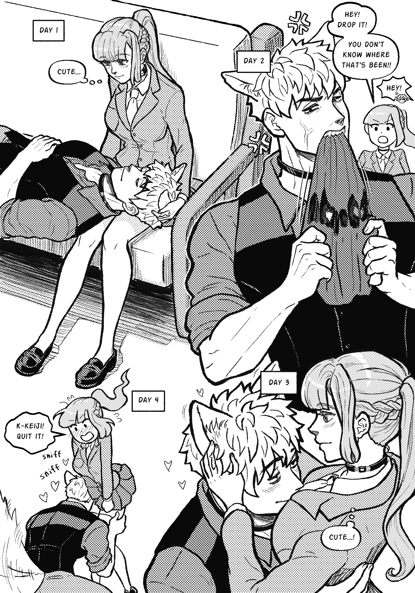 Day 7: Free choiceThis comic is a direct sequel to last year's Keisara Week comic. First cat girl Sara, now dog man Keiji. It is only the natural course of things.