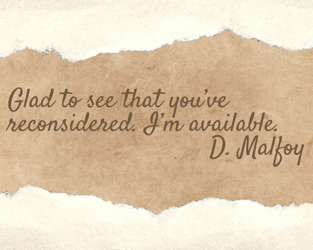 “I hardly call this a meeting, more like an abduction,” she said icily, standing up a bit straighter. He couldn’t possibly be serious. She calculated her chances of getting away as he circled close behind her, a low laugh in his throat. Her breathing finally settled, wondering if perhaps Malfoy was telling the truth.