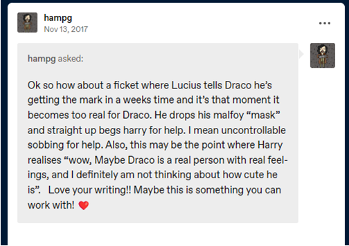 If someone were to hate him, then it should be earned, it should be justified and most of the time it wasn’t. Draco wasn’t the kindest person and there were a lot of times when he definitely said or did things that he shouldn’t, but none of it justified the hatred that was directed at him for what his father did.