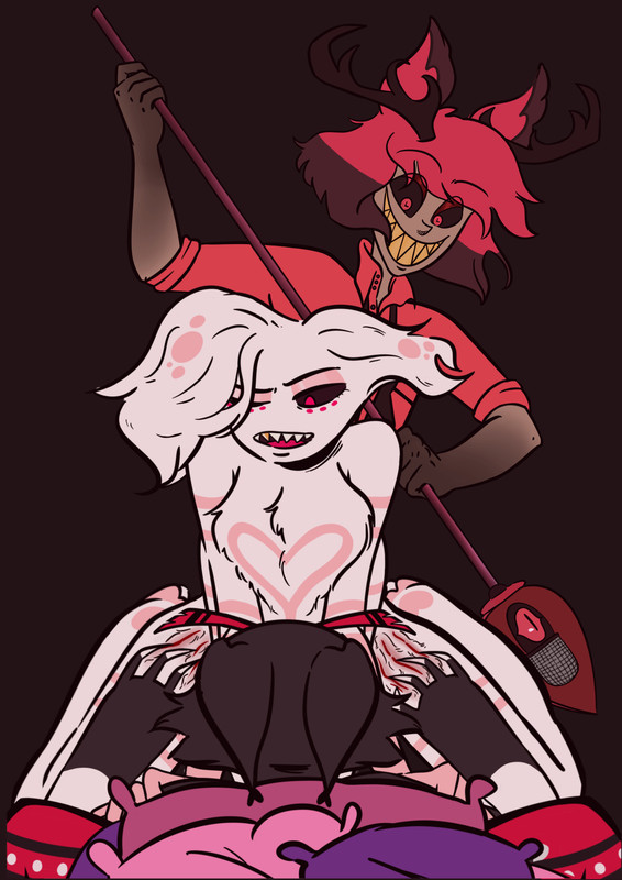Husk’s ears ticked back and he dug his claws in an Angel's hips; he watched something incandescent flash through Angel’s expression, and pulled, dragging shallow but angry gashes down his legs. Angel cried, then screamed as Alastor raked his own nails the opposite way up one of the same sets of scratches, tiny crimson beads smearing into streaks in his fur.
