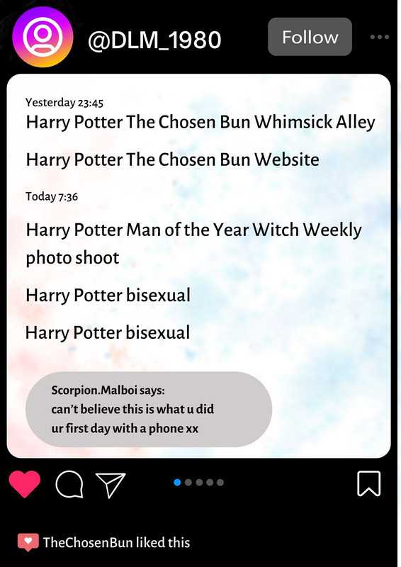 Draco clicks the heart on one of them, followed by another, smiling at the merry waterfall of glitter each time. He keeps pressing the button—it’s just so satisfying—for every half-nude baking photo. It doesn’t matter. Potter won’t know.