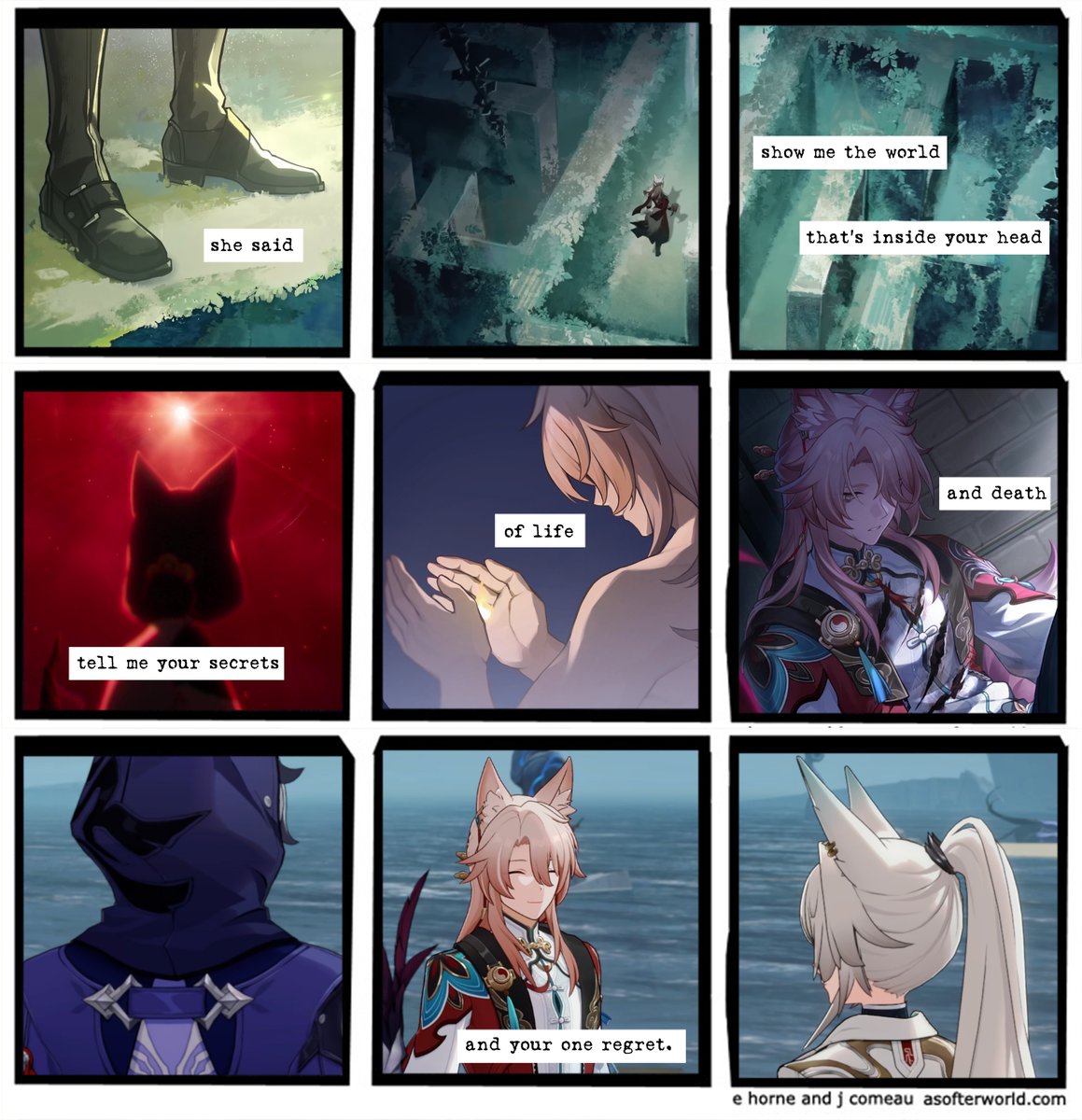 Through his rapidly fraying thoughts, he stares blankly at his dimming surroundings, and marvels at how in his last moments he only thinks of Feixiao and Moze and the world he is leaving behind. Blood bubbles up in his throat, spilling up through his lips with a gurgle. Footsteps approach. His sight is fading, the Tumbledust’s nerve damage setting in, but he can tell that one of them is dressed in black, the other in white. Heibai Wuchang must be here to collect him; death is finally at his doorstep. He listens to them come closer, and closer — he never got to have that extra-spicy Luofu hotpot with Feixiao and Moze that they had planned for after the Wardance. He hopes they will go in his stead.