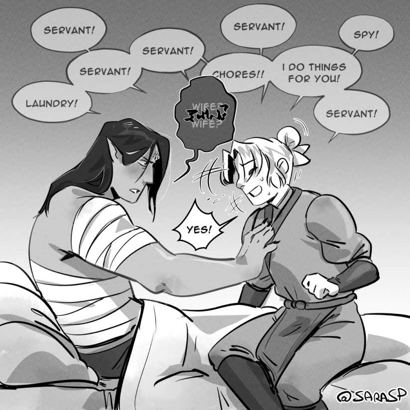 “Servant,” Shang Qinghua repeats over and over again, touching his chest. “Spy. Useful! I’m your servant, Shang Qinghua does things for my king.”