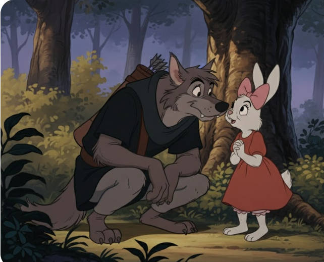 Ache leaned back against the bark of the oak, letting the sweet sound of her voice wash over him. His internal world, usually a landscape of gruff obedience, dull patrols, and the constant thrum of tension, felt completely hushed here. In her eyes, he wasn't 'Ache the Archer Wolf,' just Ache. He was a protector, a gentleman, and an audience. This little rabbit, who saw past his uniform and his species, was the only true friend he had. He cherished these moments, this island of innocence and play. He would face a hundred grumpy vultures and ten thousand of Prince John's temper tantrums just to keep this secret, this peace.