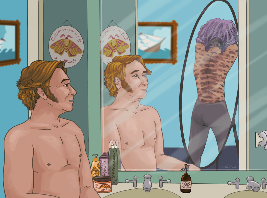 Ed’s taken his shirt off. He’s taken his shirt off to pull on the robe, and Stede can see the back of him in the sliver of his bathroom mirror reflected in the mirror over the dresser at such an angle that Ed’s mirror doesn’t catch the line of sight—goodness, Stede has a lot of mirrors, doesn’t he?—and the rippling muscles of his back move under tan skin and tattooed lines and a striped sort of grey-black pattern down his spine. Stede can feel his mouth hanging open, can feel the way his heart is pounding in his chest and against his eardrums. The pattern goes all the way up to the curve of his neck under the swinging masses of silver-iron curls, and down to the place where his spine curves in and back out, on either side of the dimples of his back. They look almost three-dimensional, like if Stede’s fingers brushed over them they’d have a different texture than the rest of Ed’s skin, and in the center of his back there’s even a hint of a shadowed ridge. Stede doesn’t have any tattoos, of course, but he’s always found them fascinating, and this one? He’s blown away by the artistry of it, the sheer skill required—