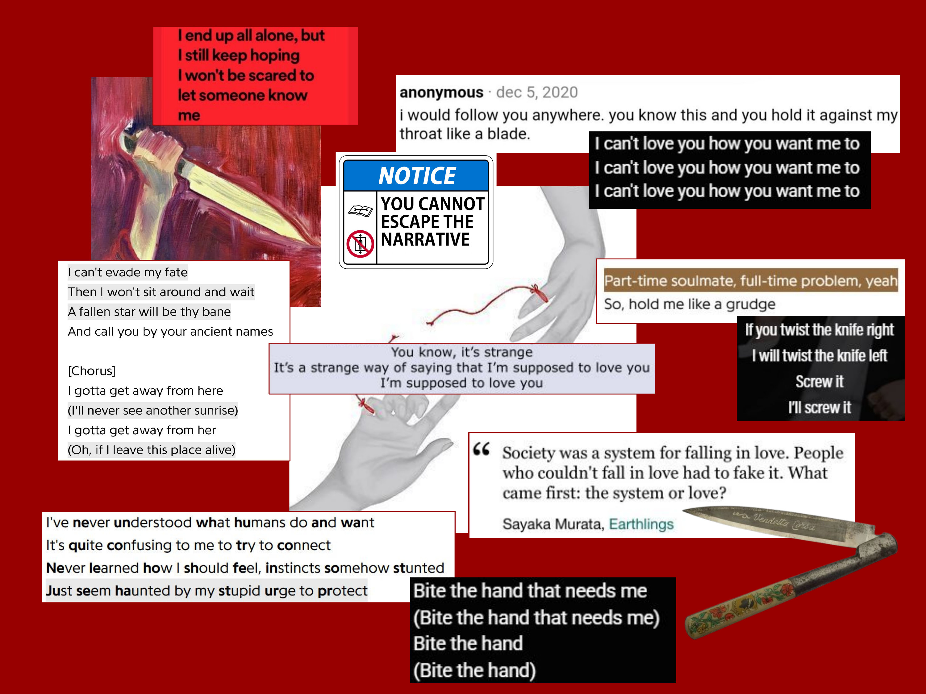 // "People Watching" - Conan Gray // anonymous // "Splitter" - Linnea Paskow // "Bite The Hand" - boygenius // "Ancient Names, Pt. II" - Lord Huron // "G. I. N. A. S. F. S." - Fall Out Boy // "Hold Me Like A Grudge" - Fall Out Boy // "Count The Ways" - The Last Dinner Party // "Earthlings" - Sayaka Murata // "Willard!" - Will Wood // all other images from pinterest and tumblr //