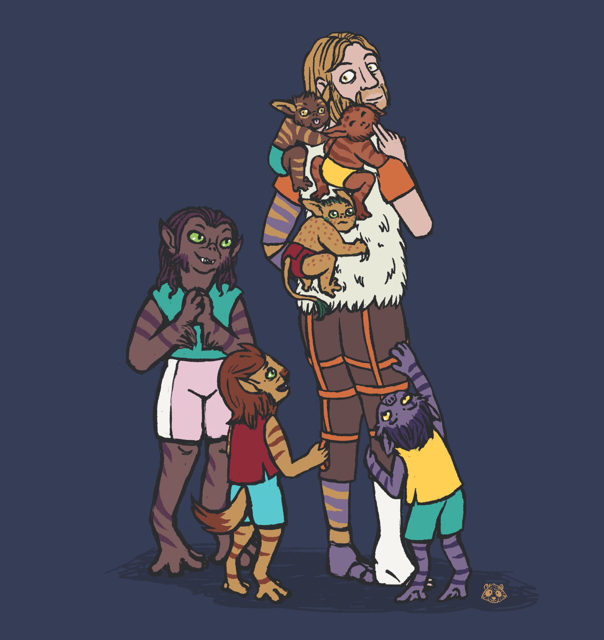 Garazeb welcomes Ezra with a big crushing hug and Kallus pats him on the shoulder. The human is wearing some kind of faux fur jacket that reveals its purpose, when Ezra spots three tiny lasat clinging to Kallus' back. There are also two larger kits, who are following behind the man, one clawed hand each firmly attached to the harness fixed to his trousers.