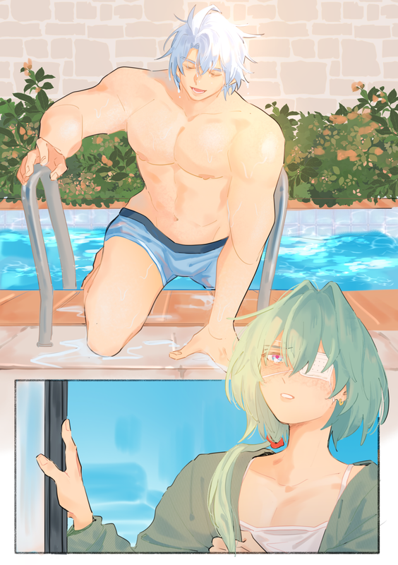 Before him was Phainon, very much shirtless, wearing a pair of short swim shorts that rode up his thigh. He’d leapt out of the water with the easy grace of someone who’d been an athlete all his life. He shook his hair out like a dog, splattering water droplets everywhere, including onto Anaxa’s face.