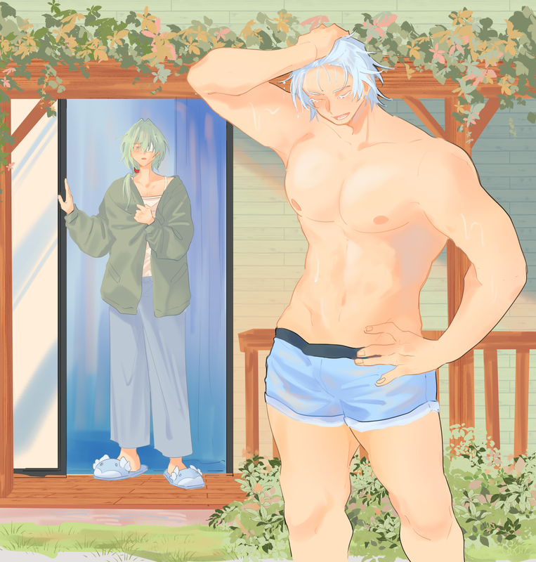 Anaxa stared. His eyes seemed to develop a will of their own. They traced over every inch of Phainon’s exposed skin, tan and shining in the hot afternoon sun. His muscles, perfectly defined, flexed subtly underneath his skin as he moved. His shoulders were broad and his waist was narrow, the sort of perfect proportions that ancient sculptors spent a lifetime trying to capture. Even the water seemed to cling to him, like it couldn’t bear the thought of letting him go.